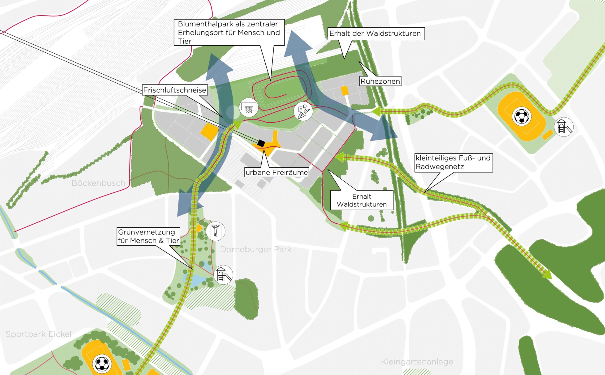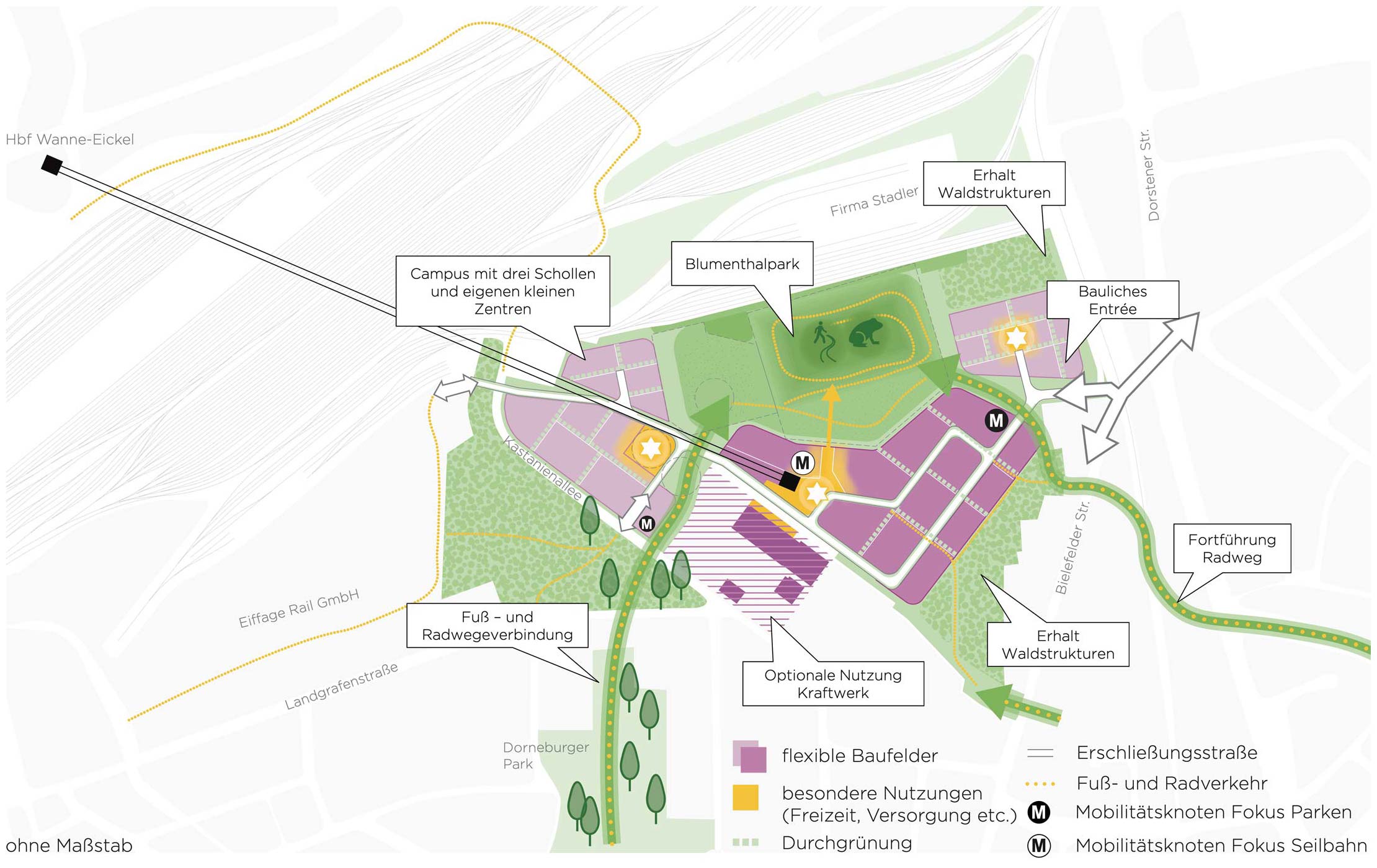 In den kommenden Jahren soll auf dem ehemaligen Bergwerksgelände ein nachhaltiges Hightech/Greentech-Quartier mit wissens- und technologieorientierten Dienstleistungen und bis zu 4.000 Arbeitsplätzen entstehen – Blumenthal hoch3. Dabei werden Bebauung und Freiräume in einem ausgeglichenen Verhältnis zueinander stehen: Rund 60 Prozent des Areals wird aus Frei- und Grünflächen sowie kleineren Waldbeständen bestehen, die größtenteils erhalten bleiben. Mit dem Blumenthal-Park ist eine grüne Oase geplant, die geschützten Tierarten einen Lebensraum bietet und gleichzeitig als stadtnaher Freizeit- und Erholungsort dient.